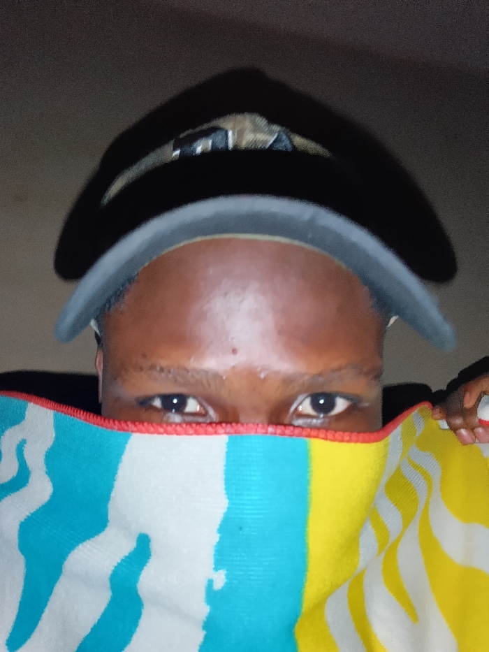 A close-up shot focuses on a person's face from the forehead down to just below the eyes. The person is wearing a black baseball cap with a patterned design above the brim. They are partially obscured by a brightly colored towel or blanket, featuring wavy stripes in yellow, white, and blue. The person's eyes are visible above the fabric, and a hand holding the edge of the material can be seen on the right side of the frame. The background is dark and indistinct.