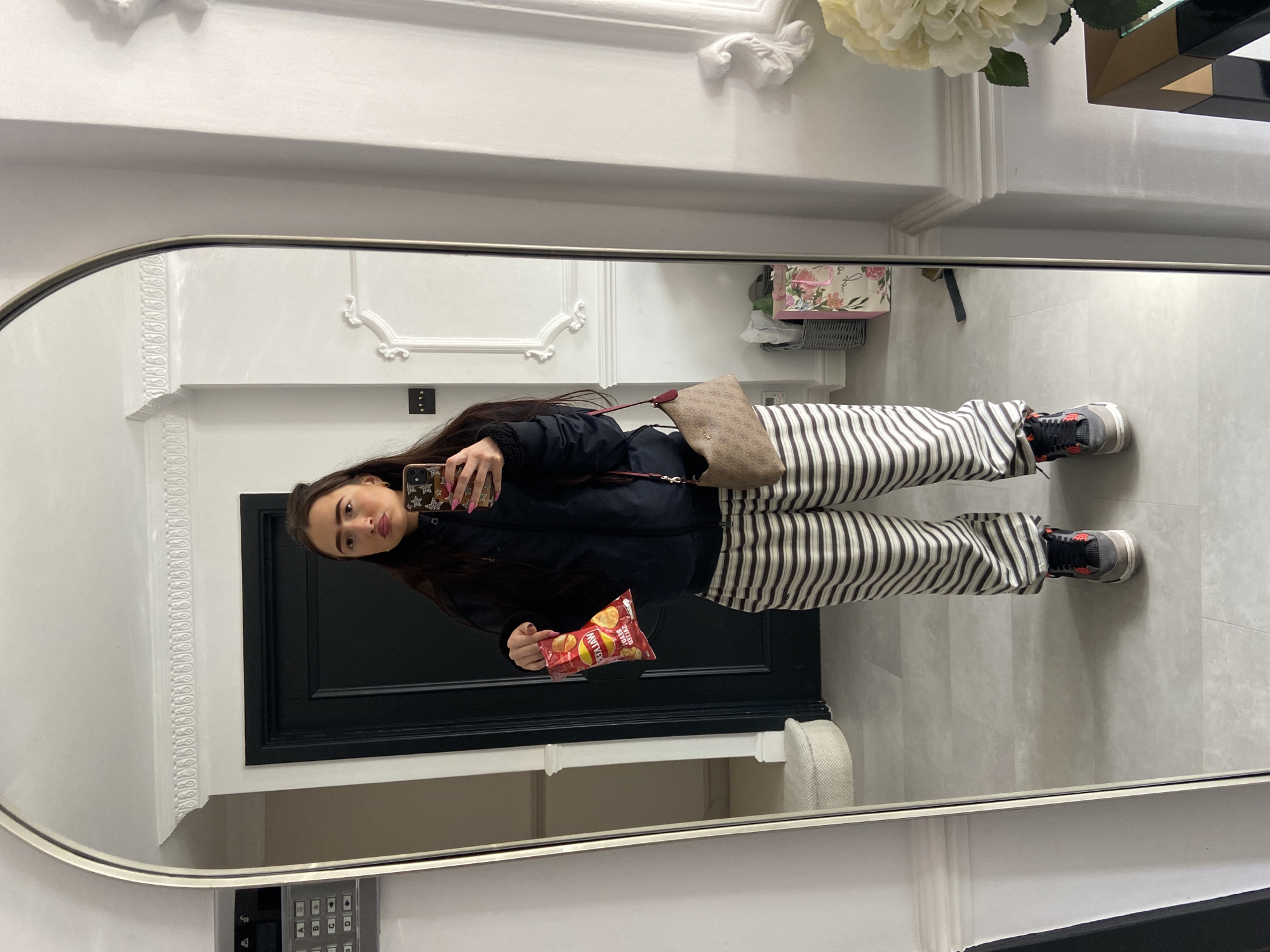 The image is a mirror selfie of a young woman indoors. She is wearing a dark jacket, striped pants, and sneakers. She is holding a bag of chips in one hand and a cell phone in the other. She is standing in what appears to be a hallway with white walls and molding. A black door is visible behind her. The location is likely in a residential building in Welwyn Hatfield, United Kingdom.