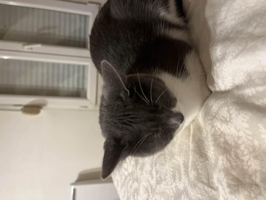 The scene depicts a domestic short-haired cat resting on a patterned bedspread within a room in Lampertheim, France. The cat, exhibiting dark gray fur on its head, back, and ears, with white fur on its chest and underside, is curled up with its eyes closed, indicative of sleep or deep relaxation. White whiskers are visible against its dark muzzle. The cat occupies the lower-center to right portion of the image. The bedspread is a light, possibly cream or off-white, fabric with an embossed or woven floral/paisley pattern. In the background, a light-colored wall is visible. To the left, a portion of a white furniture piece, possibly a radiator cover or dresser, is present. A white-framed window with horizontal blinds or shutters is visible in the center-right background. A small, light-colored, oval-shaped object hangs on the wall above the window. The room is illuminated by ambient artificial light.