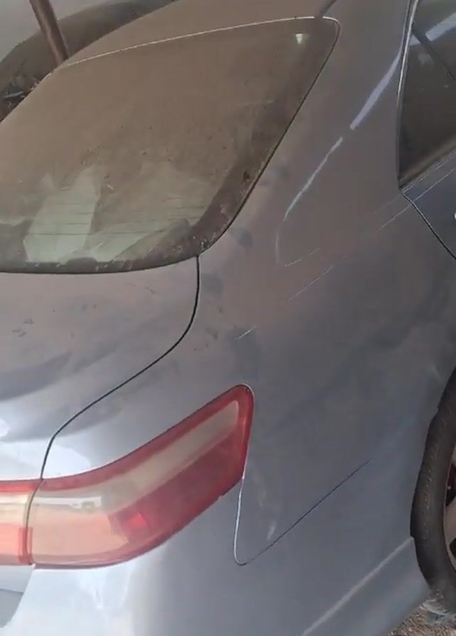 dusty gray car parked in what appears to be a garage or workshop setting. The camera focuses on the rear of the vehicle, showing the taillight, trunk, and side panel. The car seems to be a sedan-style car, possibly a Toyota Camry or similar model, judging by the shape. The surrounding environment is cluttered with various items, including hanging clothes, building materials, and what looks like a ladder in the background. There are no people immediately visible in the shot. The overall impression is that the car has been stationary for some time, as evidenced by the dust accumulation.
