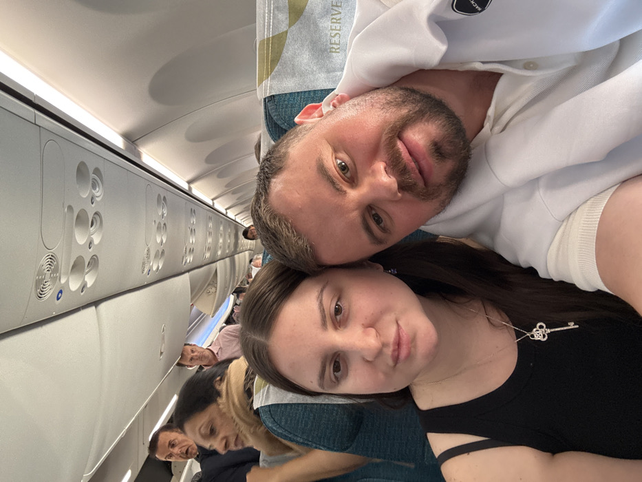 The scene is set within a commercial airplane cabin, located in Seeb Province, Oman. In the foreground, a man and a woman are captured in a selfie. The woman, positioned on the left, has long dark hair, a light complexion, and wears a black tank top. A silver necklace with a prominent key-shaped pendant rests on her chest. She gazes directly at the camera with a neutral expression. The man, on the right, exhibits short brown hair, a beard, and a mustache. He wears a white polo shirt featuring a dark circular logo with "HACKED" text on the right shoulder. He leans slightly into the frame, looking toward the camera with a faint smile, and has a white earbud in his right ear. The airplane cabin environment features rows of teal-patterned seats with white headrest covers, some marked "RESERVE." Overhead compartments, white in color, line the ceiling, beneath which panels contain individual air vents, reading lights, and call buttons. Linear fluorescent light strips illuminate the cabin lengthwise. In the background, other passengers are visible: a man with dark hair and a light blue shirt is partially seen to the left, and further back, a man in a light-colored collared shirt is visible, facing forward within the aisle.