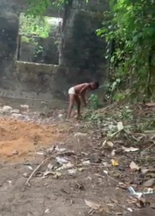 A small dark-skinned child stands in a dusty, overgrown area with a crumbling stone structure in the background. The child is shirtless, wearing light-colored underpants, and barefoot. They are bent over, appearing to gather sticks and vegetation from the ground. The area is cluttered with dead leaves and scattered trash, and greenery surrounds the structure and area.