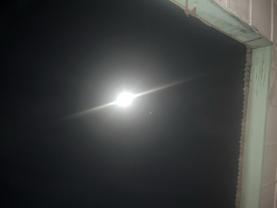 The image displays a nighttime scene in Sabon Tasha, Nigeria. A prominent, intensely bright celestial object, likely the moon, is situated in the upper-central portion of the dark sky, exhibiting a distinct lens flare effect that emanates diagonally. The sky is otherwise black with minimal, faint specks possibly indicative of distant stars. In the foreground, along the bottom edge, a section of a corrugated roofing structure with a wavy profile is visible. Beneath this, a horizontal structural beam, light green in color, extends across the lower frame. To the right, unpainted concrete building elements, possibly a wall or ceiling section, are partially visible, suggesting an exterior or semi-enclosed architectural space. No human subjects, animals, or explicit actions are discernible.