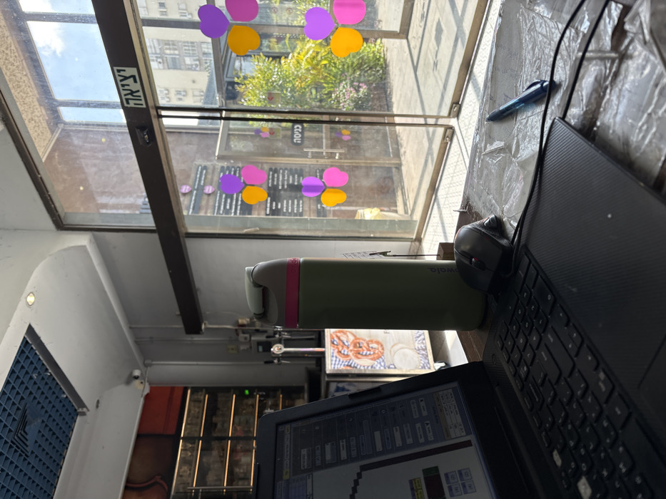 The image displays an indoor scene within a commercial establishment, likely a cafe or bar, located in Rishon LeZion, Israel, with an outdoor view through glass doors. In the foreground, a black laptop is open on a wooden table, its screen displaying a technical interface with graphs, data tables, and control elements. Adjacent to the laptop, a dark green Owala-brand water bottle with pink accents stands upright. A black wired computer mouse and a blue pen rest on crumpled clear plastic sheeting covering part of the table. The interior background reveals a bar area with multiple beer taps and shelves stocked with bottles and glasses. The ceiling features recessed spotlights and a distinctive blue grid-patterned panel. A security camera is mounted high on a wall. Through the large glass double doors, which are adorned with purple, orange, and pink heart-shaped decals arranged in clover patterns, an outdoor patio area with green bushes and foliage is visible. Hebrew signage on the upper door frame reads "יציאה" (Exit), and "כניסה" (Entrance) is visible on the lower door. Beyond the patio, multi-story residential buildings are seen under a bright, clear sky. No individuals are present in the immediate visible scene.