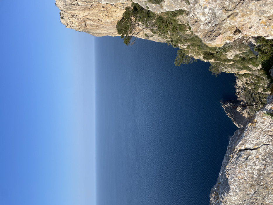 A high-angle view captures a rugged coastal landscape overlooking the Mediterranean Sea, located within the municipality of Pollença, Spain. The top third of the frame is dominated by a clear, light blue sky. Below, the calm, deep blue water of the sea extends to the horizon, exhibiting subtle surface ripples. A massive, light brown to tan colored vertical cliff face occupies the right side of the image, descending sharply towards the sea. Scattered green vegetation, including small trees and shrubs, grows on the cliff's ledges and fissures. The immediate foreground features textured, light-colored rock formations from the viewpoint. No individuals, man-made structures, or activities are visible.