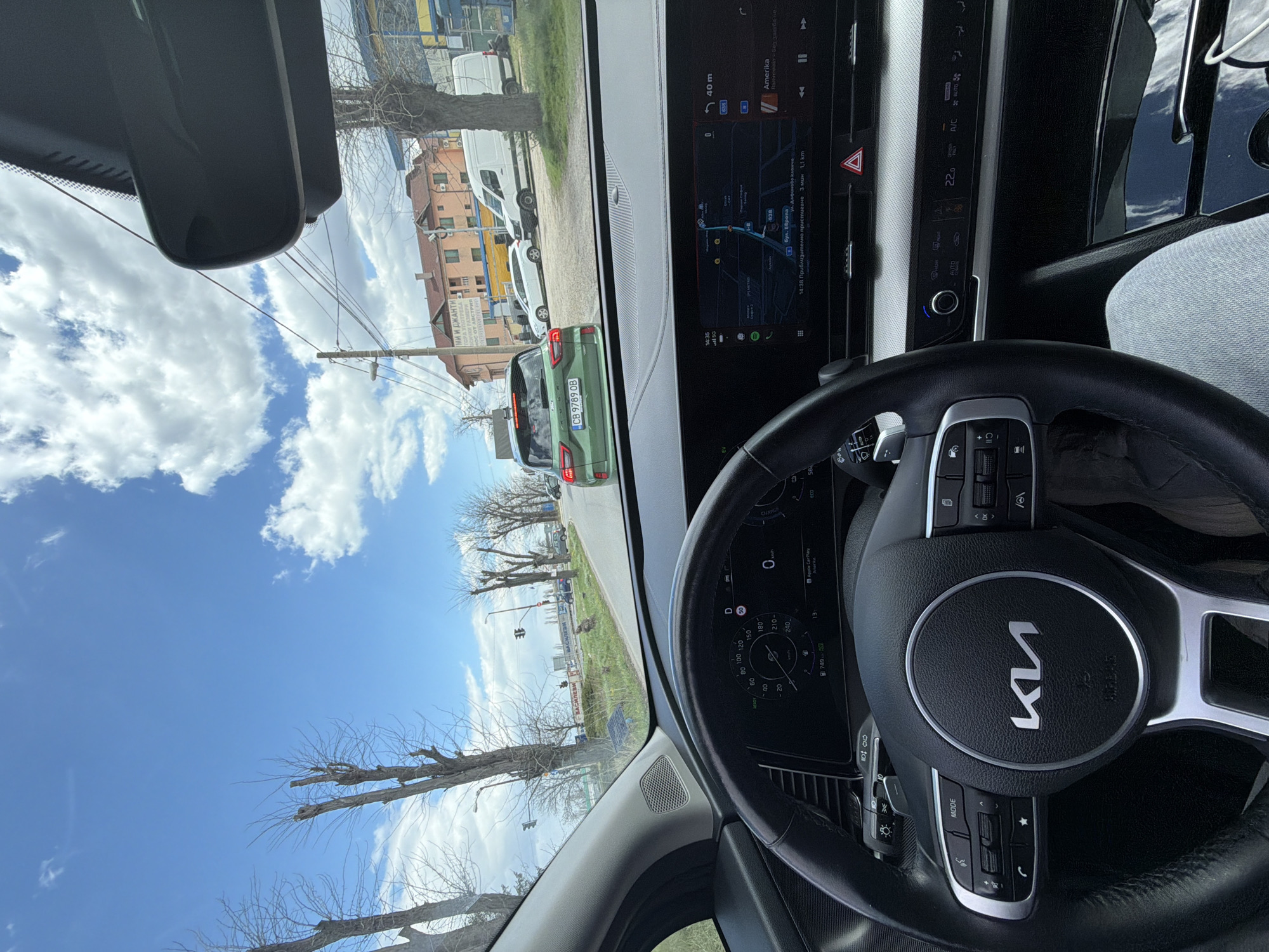 The image, taken from inside a Kia vehicle, shows a view of the road in Voluyak, Bulgaria. A green car with license plate CB 9789 OB is in front. The navigation system on the dashboard indicates a route towards "бул. Европа" (Bul. Evropa), approximately 1.1 km away. The dashboard shows the outside temperature at 22 degrees Celsius. The speedometer reads 0 km/h, indicating the vehicle is stationary. The sky is blue with scattered clouds. Buildings and trees line the road.