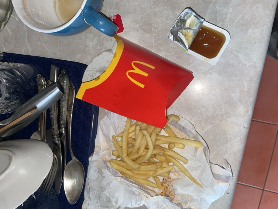 The image displays an indoor scene on a light-colored, possibly mottled countertop. In the center, a pile of golden-brown French fries rests on crumpled white paper, stained with grease or sauce. A red McDonald's fry box, bearing the yellow "M" logo, lies on its side next to the fries. To the right, an opened individual packet contains a quantity of brown dipping sauce. A blue ceramic mug with a handle is positioned in the upper right, containing light brown liquid residue and a red tea tag hanging from its handle. The upper left shows a stack of assorted silverware, including forks and spoons with ornate handles, arranged on a dark blue mat. A white ceramic dish or bowl is inverted atop the silverware. A clear glass container is partially visible behind the silverware. The lower periphery of the image reveals a reddish-brown tiled floor. No individuals are depicted. No visual information is present within the image to identify its location as Dnipro, Ukraine.