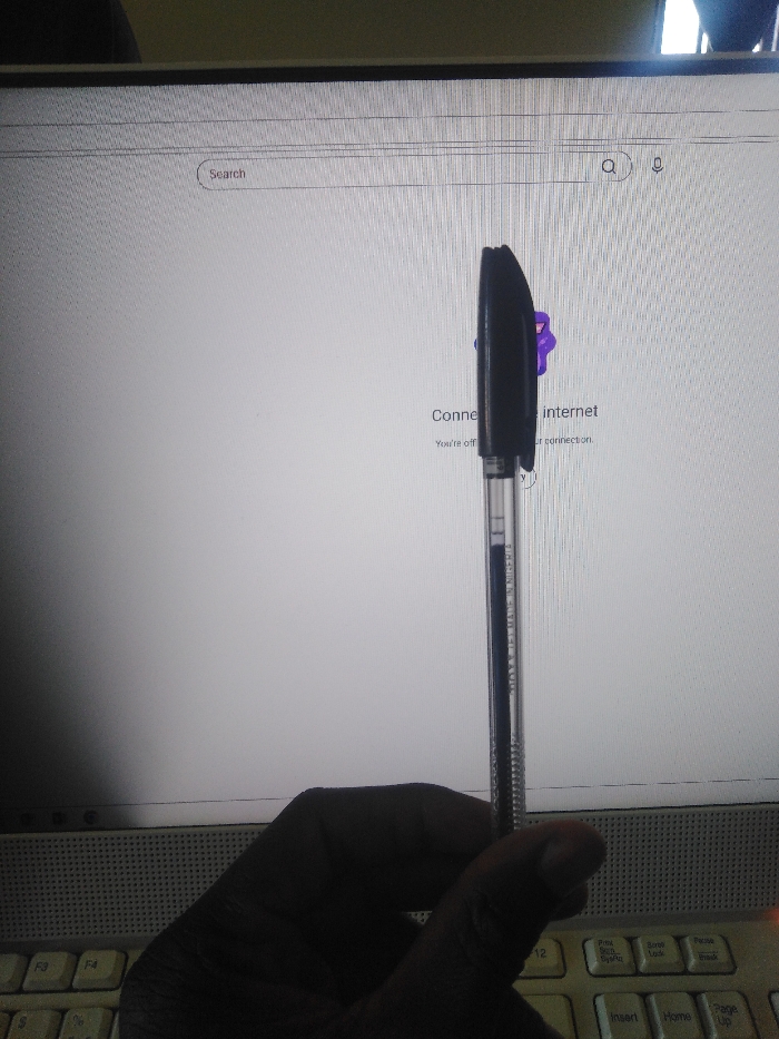 The scene, located in the city of Ban, Nigeria, displays a human hand holding a pen against a digital display. A dark-skinned hand is visible in the lower-left foreground, holding a translucent-barreled black ballpoint pen vertically. The pen contains blue ink and has "BIC" visible on its barrel. The pen and hand are positioned in front of a luminous computer monitor screen that shows a web browser interface. The browser displays a "Search" bar at the top and the text "Connect to the internet" followed by "You're off...your connection," indicating an offline status. A partial purple graphic is visible behind the pen's clip. The upper portion of a light-colored computer keyboard, showing keys such as F3, F4, F12, Insert, Home, and PgUp, is visible at the bottom of the frame, underneath the hand and monitor.