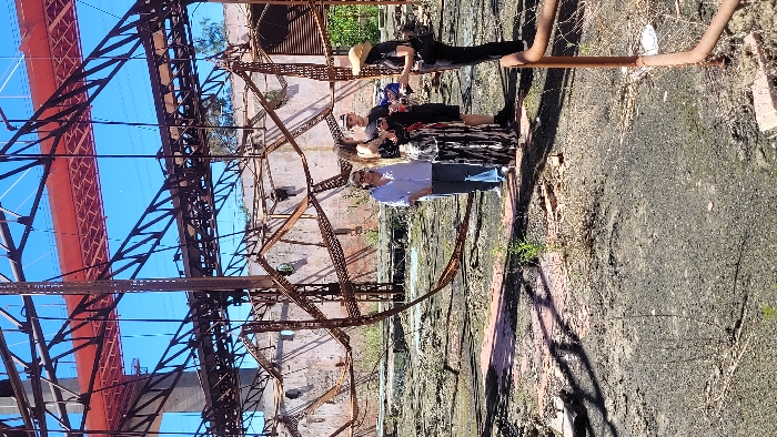 The scene depicts an outdoor environment at a derelict industrial site in Zárate, Argentina, under a clear blue sky. The ground is uneven, composed of dark soil, scattered debris, and sparse vegetation, with shadows cast across it. In the midground, four individuals are standing. From left to right: an adult female in a light blue collared shirt and blue jeans, wearing sunglasses; a young adult female in a black and white patterned long skirt and a dark top; a young adult male in a black t-shirt, dark shorts, and a black baseball cap, holding a dark object and a red can; and an adult female in dark clothing and a wide-brimmed light-colored hat, facing the group while holding a small object and gesturing. The individuals appear to be interacting or observing. The background is dominated by the extensively rusted steel framework and concrete remnants of a large, partially collapsed industrial building. Above this structure, a segment of a large, red-painted suspension bridge, identifiable as part of the Zárate-Brazo Largo Bridge complex, is visible against the clear sky, along with associated support columns and overhead electrical lines.