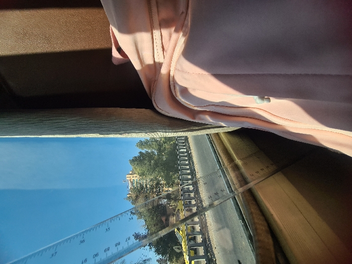 The image depicts an outdoor urban scene in Ashrafia, Syria, viewed from inside a vehicle. A transparent ruler, marked with metric measurements including numerals like 87, 88, 89, and 90, is positioned vertically against the vehicle's window, partially obscuring the external view. Outside the window, a clear blue sky fills the upper portion of the frame. Below the sky, a multi-story building featuring a darker rooftop structure is visible, partially obscured by a line of green trees. In the mid-ground, a road with multiple lanes is separated by a series of grey road barriers. A yellow vehicle is visible on the far side of these barriers. On the right side of the image, within the vehicle's interior, a light pink garment, characterized by visible stitching and a white drawstring, is prominently displayed. Sunlight casts distinct shadows across the fabric. The vehicle's interior framing the window appears to consist of dark brown and lighter, textured paneling.