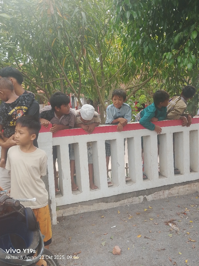 The image captures an outdoor scene in Wanguk, Indonesia, featuring a group of approximately eight young boys during daytime