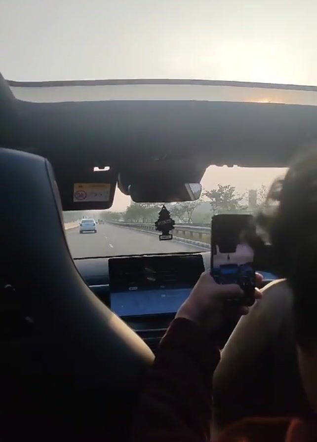 view from inside a moving car on a highway. The passenger side of the car is primarily visible. The person sitting in the passenger seat is using their mobile phone to film. Outside, other cars are visible on the road. The sky is bright and hazy.