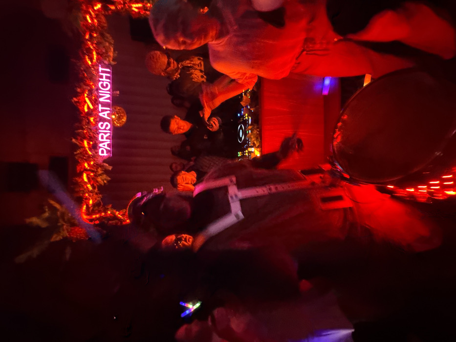 The image displays an interior view of a nightclub or event space, likely "Paris Nightclub" in West Hollywood, United States, identifiable by a prominent red neon sign stating "PARIS AT NIGHT" centrally positioned above a DJ booth. The scene is illuminated primarily by intense red lighting, casting a strong hue over all subjects and objects. Above the neon sign, decorative foliage or tinsel adorned with red string lights is visible, along with a small disco ball. In the foreground, slightly to the left of center, an individual wearing a dark garment with a white, T-shaped harness or strap system is depicted. This person is actively engaging with a large, dark percussion instrument, possibly a drum, partially visible at the bottom of the frame. To the right, another individual in a light-colored top stands with their back partially turned towards the camera, illuminated by the red light. In the mid-ground, a DJ operates mixing equipment and turntables positioned on a counter, which also holds several bottles. To the right of the DJ, another person with dark glasses and a patterned shirt is visible. Numerous other figures are discernible in the background, appearing as blurred silhouettes and forms, suggesting a crowded environment. On the far left, a person holds a multi-colored glowing object, possibly a glow stick. The overall environment indicates a lively, music-focused social gathering.