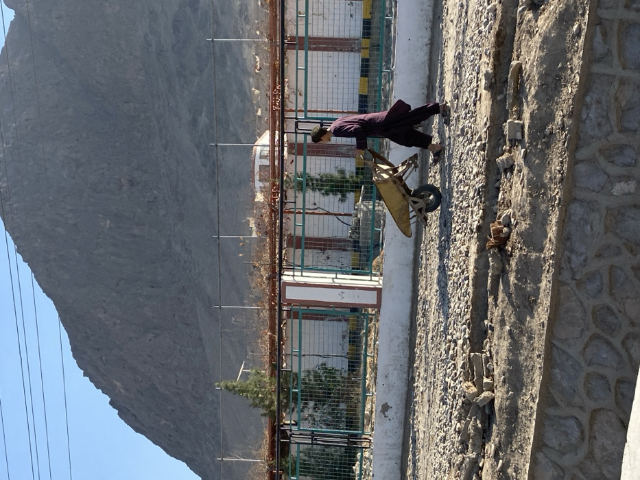 - "The image captures a young male individual, dressed in a dark purple tunic and trousers with sandals, pushing a yellow metal wheelbarrow across an unpaved, gravel-strewn path in کوکران, Afghanistan" by FM-B5wmg2, licensed under CC BY 4.0