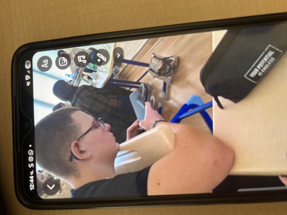 A smartphone, framed in black and resting on a light-colored wooden surface, displays a photograph taken within a classroom environment in Buzovgrad, Bulgaria. The central figure of the displayed image is a young male, viewed from his left profile, with short brown hair and black-rimmed glasses with red temple accents. He wears a dark short-sleeved shirt and a bracelet on his right wrist, and is engrossed in operating a light-colored smartphone held in both hands, with his right elbow resting on a light beige desk. In the foreground of the displayed image, a section of a light-colored wooden desk is visible, upon which lies a black pencil case featuring the white text "YOUR POTENTIAL IS ENDLESS." In the background, multiple individuals, likely students, are seated at similar wooden desks with blue-framed chairs. One individual with dark hair and a plaid shirt is partially visible from behind. A clear plastic bottle with a green cap rests on a distant desk. On the light-colored floor, a translucent bag containing miscellaneous items is situated near the leg of a blue-framed chair. The displaying smartphone's screen also shows an overlay of digital interface elements including the time "12:44," network indicators (5G, Wi-Fi), a battery level of "48%," and a vertical column of white circular icons representing text, stickers, music, and drawing functionalities.