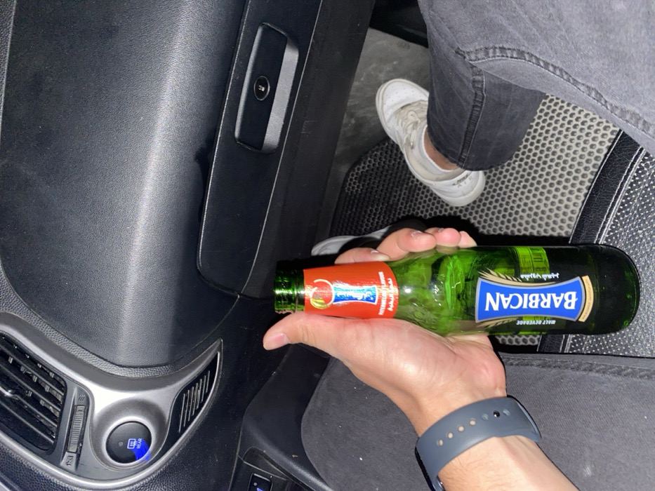 A close-up image depicts the interior of a vehicle, focused on a person's lower body and a beverage bottle
