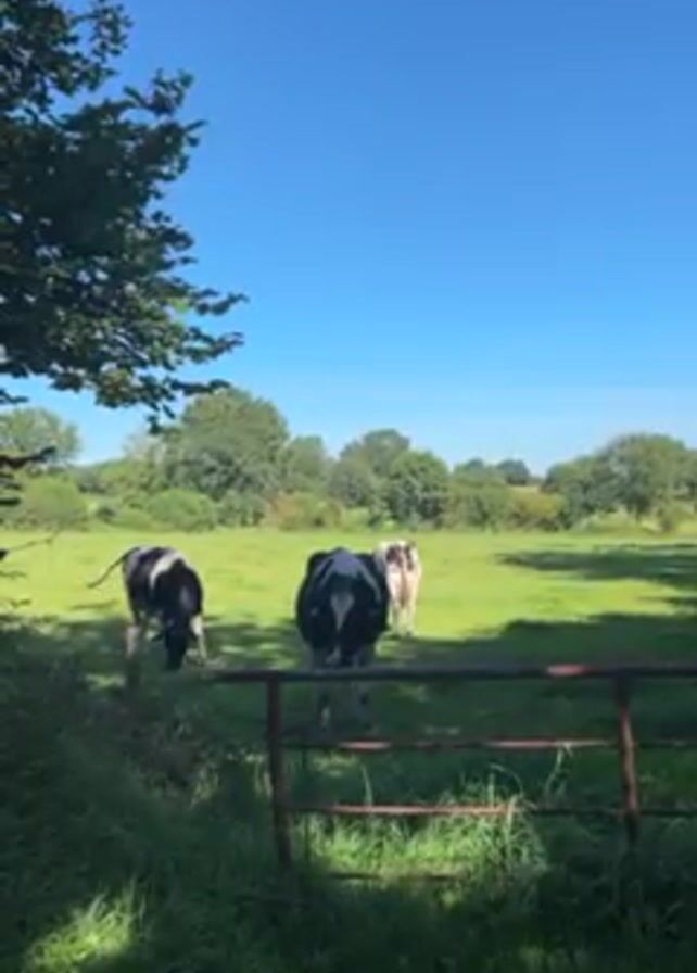 field of green grass under a clear blue sky. Three cows, mostly black and white, are grazing in the field. A rusty gate separates the viewer from the cows. A tree with dense green foliage is on the left side of the frame. The background contains additional trees. The lighting suggests it is a sunny day.