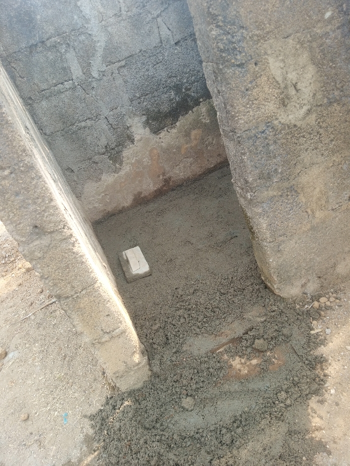 The image displays an unfinished construction area in Kachia, Nigeria. The scene is bounded by rough, grey concrete block walls: one on the left, a back wall showing discoloration and minor cracks, and a thick vertical concrete element on the right. The floor space between these structures is covered with an uneven layer of freshly laid, loose grey concrete or mortar. A single, small, rectangular, light-colored block or object rests on this fresh concrete near the back left corner. Near the bottom right, a reddish-brown object or patch is partially visible beneath the loose concrete. The periphery of the area consists of bare earth and scattered debris. No individuals are present, and no actions or interactions are depicted. The scene is brightly illuminated, suggesting outdoor or open-air conditions.