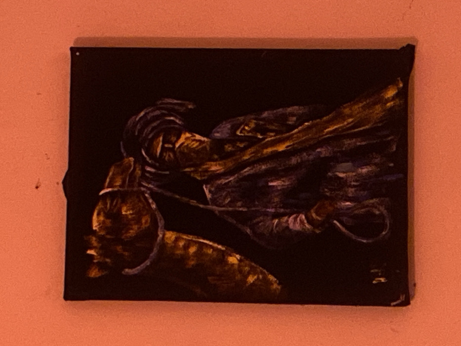 A dark, abstract painting on a square canvas. The background is solid black. Brown and tan figures with hints of purple and white create dynamic shapes. A profile of a head and neck is visible in the lower left, connected by a rope-like line to other indistinct forms resembling limbs and fabric. The painting seems to capture a moment of tension or movement, with a somber and mysterious mood.