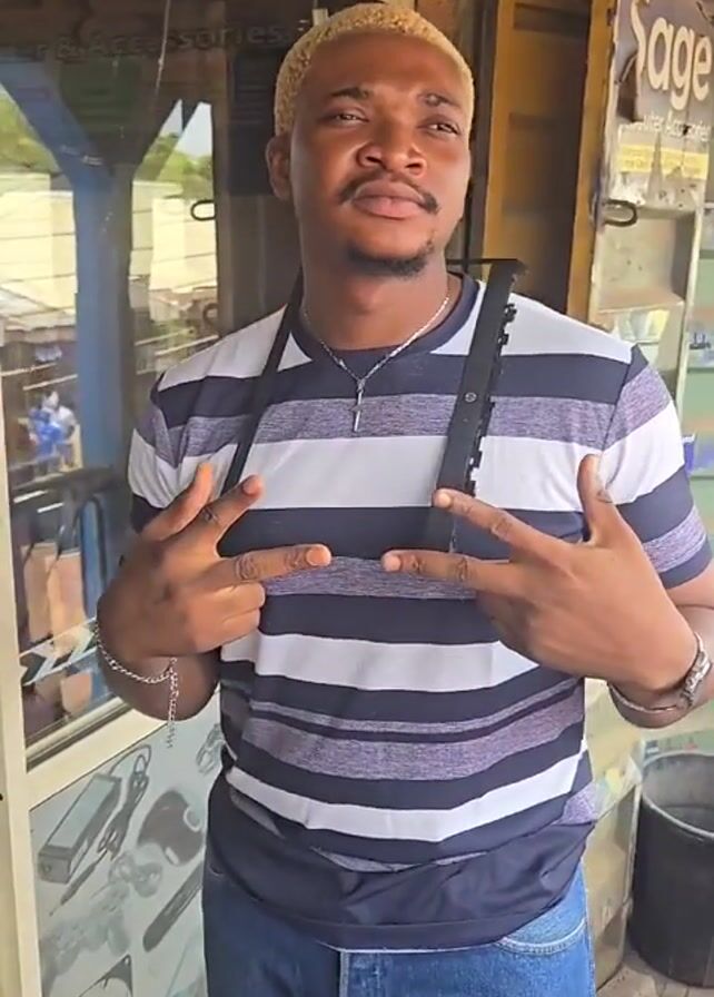 A light-skinned man stands in front of a glass door, wearing a navy and white striped shirt, blue jeans, a silver necklace with a cross, a watch, and bracelets. He has short, dyed-blonde hair and a light mustache and goatee. He is holding up two fingers in a peace sign with both hands. A black object is hanging around his neck like a strap. The glass door is decorated with posters and advertisements. A sign that reads "Sage" is visible above the door. A black trash can sits to the right of the door. The background shows a street scene with buildings and vegetation.