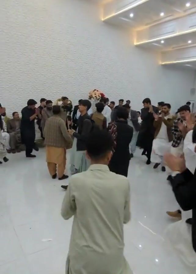 Several men are gathered in a large room with white tiled floors and white patterned walls. Most of the men are wearing traditional Pakistani clothing like shalwar kameez, though some are wearing suits or blazers. Many of the men are clapping and dancing. In the center of the group is a drummer, who appears to be the focus of the celebration. The room has a modern lighting fixture in the ceiling. There are a few chairs along the back wall.