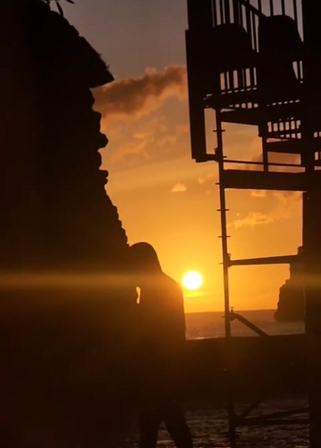 The video captures a silhouette of a person standing near a rocky area during sunset