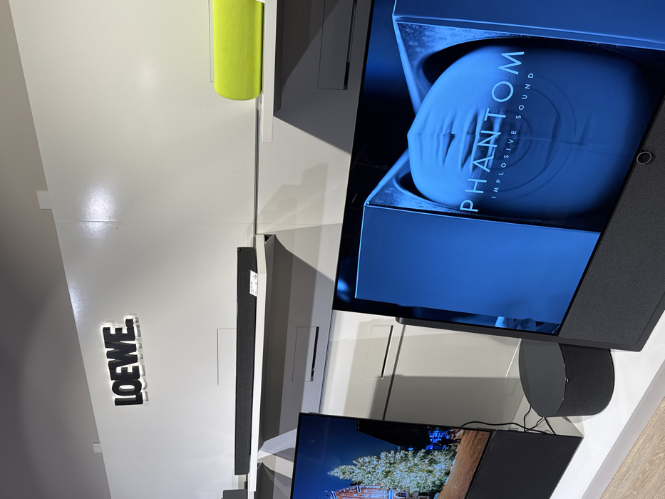 The image displays an electronics retail display area, identified by the illuminated "LOEWE" brand logo on a white wall