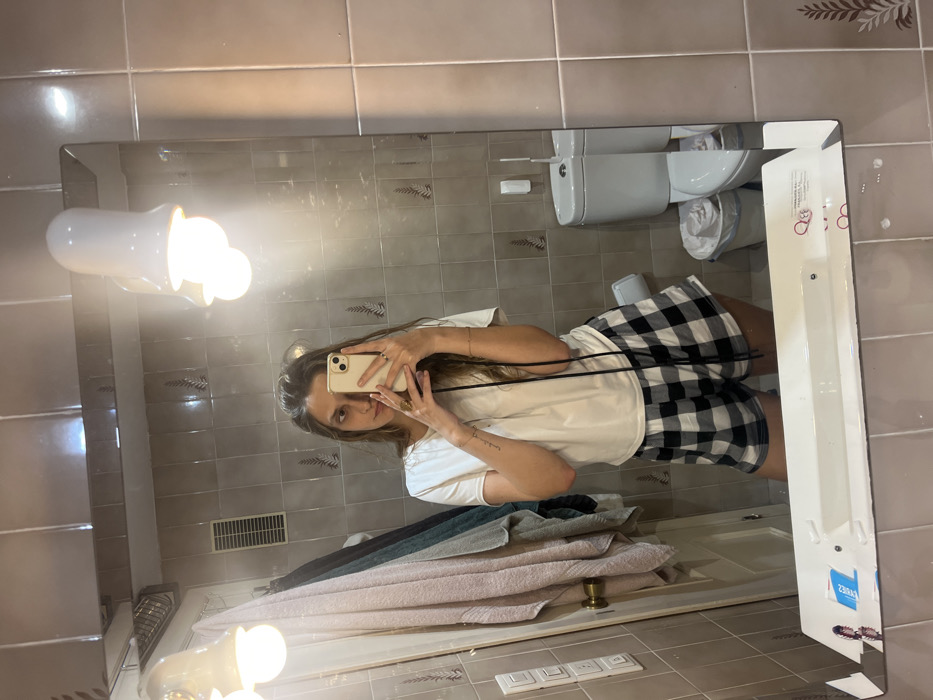 A woman is depicted taking a mirror selfie in a residential bathroom, located in the city of Valencia, Spain. The subject, possessing long brown hair and wearing a white short-sleeved t-shirt and black-and-white buffalo check shorts, holds an off-white smartphone with both hands directly in front of her face, partially obscuring it. A black cord extends from the phone, suggesting it is worn around her neck or shoulder. A ring is visible on her right hand (left in reflection), and a small inscription or tattoo is on her left forearm (right in reflection). The bathroom environment, reflected in the large rectangular mirror, features light brown/beige tiled walls with a repeating stylized fern leaf pattern. Two wall-mounted light fixtures with white, bell-shaped shades and illuminated bulbs are present on either side of the mirror. A white ceramic toilet with a dual-flush mechanism is visible on the right side of the reflection, alongside a white plastic trash can containing crumpled paper. To the left, a wooden door with a brass-colored doorknob is partially open, revealing multiple towels (pink, gray, and dark-toned) hanging on a rail or hooks. A white rectangular ventilation grate is situated above the towels, and a white electrical outlet panel with multiple sockets is visible further left on the wall. Chrome or metallic-finished cabinets are reflected at the top of the mirror, and the edge of a white sink basin is visible at the bottom.