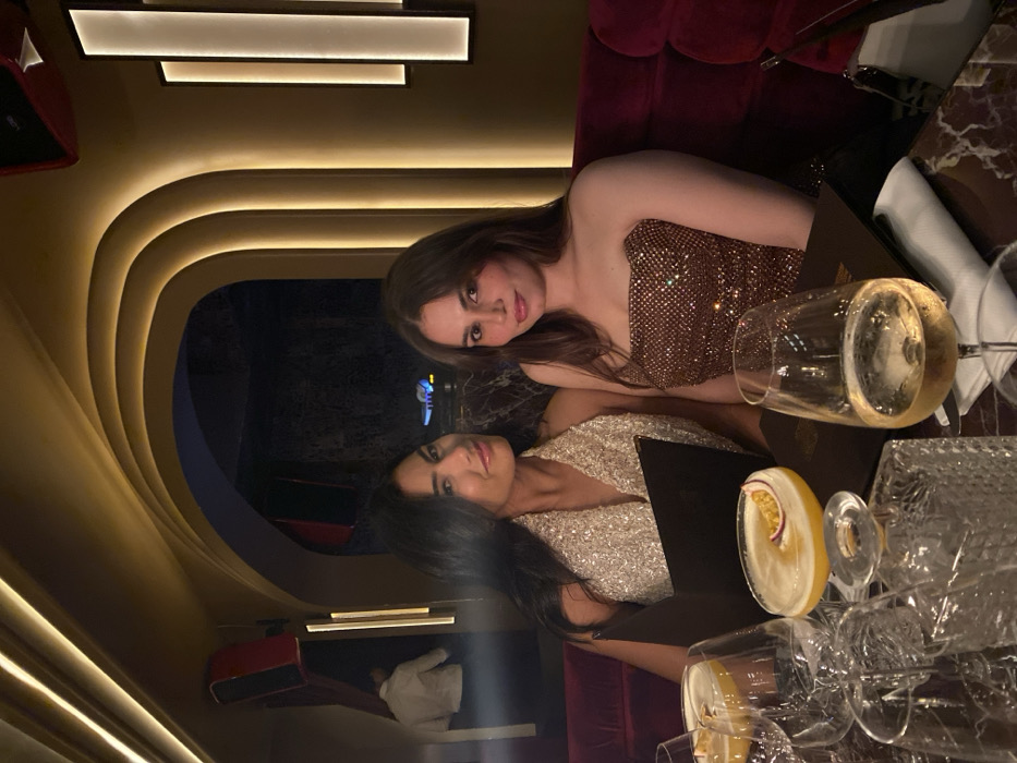 Two adult females are seated at a table in a dimly lit, opulent restaurant or lounge, identified as Gigi Paris, France
