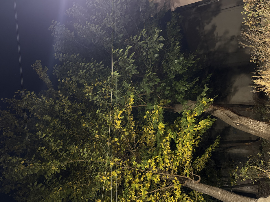 The image depicts an outdoor nocturnal scene in Yerevan, Armenia, focusing on several mature deciduous trees under artificial illumination. The left side of the frame is dominated by a tree with vibrant yellow-green foliage, strongly lit by an unseen light source from the left. Its trunk is visible, leaning slightly to the left. Adjacent to it and extending to the right, other trees feature a mix of green and partially yellowed leaves, with progressively darker foliage towards the far right due to less direct light. Two thin, dark utility wires traverse horizontally across the upper middle section of the frame. In the background, a light-colored, possibly stucco or concrete, wall runs horizontally, upon which distinct shadows of the trees and their branches are cast from the left-side illumination. The ground in the foreground consists of dry, light brown grasses and sparse, dark vegetation. No individuals, animals, or specific objects are discernible beyond the natural environment, wall, and wires. The sky is dark, indicating nighttime.