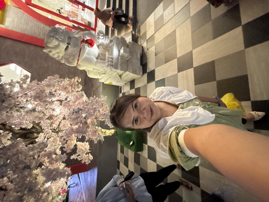 An individual is depicted taking a low-angle selfie within what appears to be a commercial or entertainment complex in Surabaya, Indonesia, characterized by festive, East Asian-themed decor. The primary subject, a woman with brown hair, wears a light green dress, a white short-sleeved top, and light-colored pointed-toe shoes with a gold accent, holding a yellow object in her left hand while extending her right arm to capture the image. She smiles faintly towards the camera. In the background, to the left, a person in a light blue top and dark pants walks away, holding a smartphone. Central to the background is a large, artificially illuminated cherry blossom tree with light pink flowers, rooted in a small green patch. To its right stands a light gray stone Foo Dog statue, decorated with a red ribbon and tassel, resting on a tiered base. Further right, a third person, wearing a brown hijab and light brown clothing, sits on steps leading up to an area framed by distinctive red architectural arches, indicative of Chinese design. The floor throughout the scene is covered in a checkerboard pattern of alternating light and dark gray square tiles. The environment is artificially lit, emphasizing the decorative elements. This setting, with its prominent Chinese-style guardian lion and cherry blossom displays, suggests a seasonal or permanent cultural exhibition, typical of a shopping mall or themed public space in Surabaya.