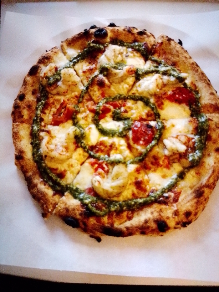 - "A circular pizza is centrally depicted, presented on a light-colored parchment paper, which rests within a brown or cardboard container" by FM-mu3Bo2, licensed under CC BY 4.0