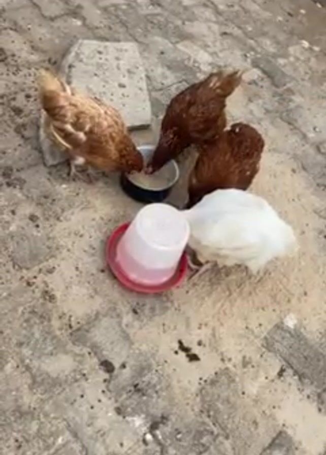 group of chickens eating from a bowl. There are four chickens in total: three brown and one white. They are gathered around a small, dark-colored bowl filled with light-colored feed. Next to the bowl is a white plastic water dispenser with a red base. The chickens are pecking at the food in the bowl. The ground is a combination of dirt and grey paving stones. Some loose feed is scattered around the bowl.