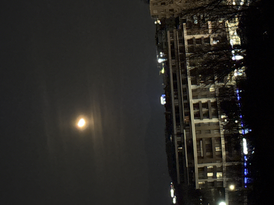 The image displays a nighttime cityscape in Sofia, Bulgaria. The upper portion of the frame is dominated by a dark sky containing thin, horizontally stratified clouds. A luminous, hazy, yellowish-white orb, identified as the moon, is visible slightly above the center of the sky, appearing partially obscured by atmospheric conditions. The middle ground features a prominent multi-story building, likely residential or commercial, with a light-toned facade. This structure exhibits multiple floors, each with balconies and windows, some of which are illuminated from within. A visible sign is present on one of the upper levels of this building. Adjacent to it on the right, a portion of another building is visible. The immediate foreground is characterized by dark, silhouetted bare trees or bushes, partially obscuring the base of the buildings and the ground level. Below the main architectural structures, multiple bright, blurred light sources are present, indicative of streetlights or vehicular traffic, some exhibiting a distinct blue illumination. In the distant background, faint, dark outlines consistent with mountains are discernible on the horizon, behind the scattered urban lights. No individuals, specific actions, or interactions are visible.