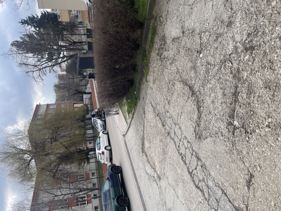 The image presents an urban street scene in Razgrad, Bulgaria. The foreground consists of a heavily cracked and worn concrete or asphalt surface. To the left, a two-lane road is visible, where a dark green SUV is parked closest to the camera, followed by a white hatchback and a silver hatchback, all facing away from the viewer. On the right side of the midground, a dense, leafless brown hedge runs parallel to the road, separated by a narrow strip of green grass and a concrete curb. A person, viewed from behind, wearing light-colored trousers and a dark jacket with a colorful pattern on the back, walks on the sidewalk alongside the hedge, moving from left to right. Further along the sidewalk, behind the hedge, two additional individuals are partially visible near a dark utility box or kiosk. Behind this kiosk, several waste bins (yellow and green) are present. In the background, a multi-story building with a reddish-orange roof and a light-colored facade dominates the left side, partially obscured by several bare deciduous trees, including a large tree with long, drooping branches. Additional bare trees and some evergreen conifers are scattered throughout the background, with other multi-story residential buildings discernible in the distance. The sky above is overcast with patches of brighter cloud cover.