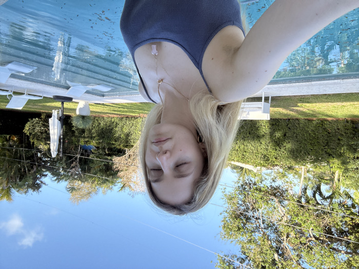 The image displays an outdoor residential backyard in Coral Gables, United States of America, under a clear blue sky. An adult female, fair-skinned with long blonde hair, occupies the foreground, appearing to capture a self-portrait with her eyes closed. She wears a dark grey ribbed tank top and a gold necklace featuring a light pink, shirt-shaped pendant. Behind her is a light blue swimming pool with two white lounge chairs partially submerged and some leaves floating on the surface. The pool is bordered by a light-colored paved deck. In the background, a manicured green lawn is visible, bordered by a dense green hedge and various trees, including palms. Additional outdoor furniture consists of a white bench to the left, and two white lounge chairs with a folded white patio umbrella on the right side of the pool area.