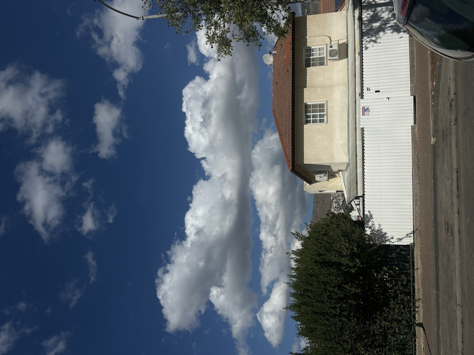 The image presents a static, bright daytime scene in a residential area of Karmiel, Israel. The upper half is dominated by a deep blue sky populated with numerous distinct white cumulus clouds. The central focus is a two-story residential building with light beige stucco walls and a reddish-brown tiled roof. The building's visible facade features two rectangular windows with white frames and internal grids. Two external air conditioning units are mounted on the wall below these windows. A satellite dish is visible on the roof. The property is fronted by a white corrugated metal fence, approximately two meters in height, with a pedestrian gate positioned centrally. A small blue and red sign, along with the number "27," is affixed to the fence above the gate handle. To the left of the fence, a dense, dark green bush partially obscures a dark metal fence line. A portion of a dark vehicle, specifically its rear window and bodywork, is visible on the far right in the foreground. A street light pole with some light green foliage is also partially visible on the far right. The immediate foreground consists of a dark asphalt road surface next to a lighter concrete curb or sidewalk. In the background, beyond the residential structures, sparsely vegetated hills are visible, dotted with numerous residential buildings, indicative of an urban development on a hilly landscape. No individuals are present in the scene, and no overt actions or interactions are depicted.