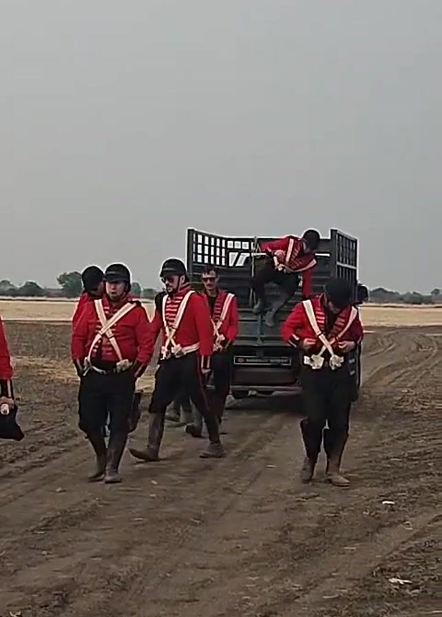 A group of men dressed in period military costumes walk in a field near a truck. The men are wearing red jackets with white crisscross belts, black pants, and boots. Some have hats, others are bareheaded, and one wears sunglasses. They are walking on a dirt road or field towards the left of the frame. Behind them is a truck with a metal cage-like bed. The field appears to be agricultural, with some crops or stubble visible. The sky is overcast and grey. One of the men is dismounting from the truck.