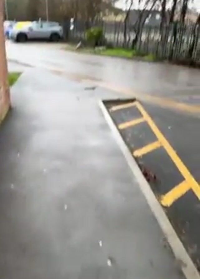 first-person perspective of someone walking on a wet, grey sidewalk. There are bits of trash scattered on the sidewalk. The sidewalk leads to a small, paved area with yellow lines marking a parking spot. Beyond the parking area is a street with parked cars, trees, and a fence. It appears to be a cloudy, rainy day. The ground is wet.