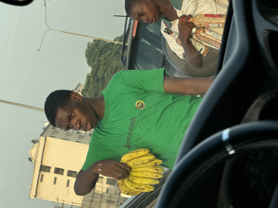 A young man in a green Monica.cash t-shirt holds a bunch of bananas outside a car window. Another person is behind him, holding multiple bottles of peanuts. The background shows a building and a street light. The image is shot from inside the car, showing part of the steering wheel.