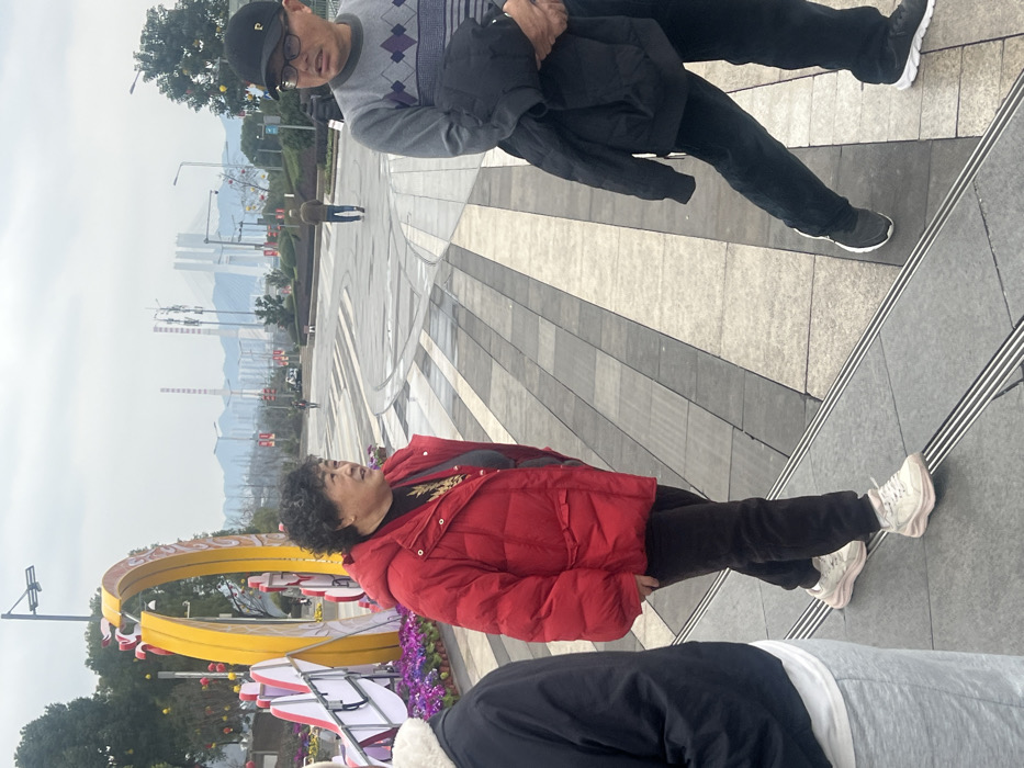 The image depicts an outdoor pedestrian area in Banan, China, under an overcast sky. In the foreground, three individuals are present. A woman with dark, curly hair, wearing a red puffer jacket, a dark patterned shirt, dark pants, and white and pink sneakers, walks from left to right, looking towards the right side of the frame with a slight open-mouthed expression. Partially visible on the far left is the torso and legs of another person, wearing a dark jacket over a white undershirt and light gray sweatpants. To the right of the central woman, a man wearing a gray long-sleeved sweater with a purple and white argyle pattern, dark pants, black and white sneakers, and a black baseball cap with a white "P" logo, carries a black quilted jacket over his left arm while looking towards the left. The ground is paved with alternating light and dark gray rectangular tiles arranged in a striped pattern, featuring curved demarcation lines. To the immediate left of the central figures, a decorative structure is visible, consisting of a large yellow archway with red and white elements, surrounded by purple flowering plants in planters. In the mid-ground, a lone male figure in dark clothing walks away from the viewer on the paved area. The background reveals a cityscape with distant hills, multiple tall industrial chimneys, and two large suspension bridges with prominent towers, suggesting a waterfront or riverine setting. Several streetlights and smaller green trees are also visible throughout the scene.