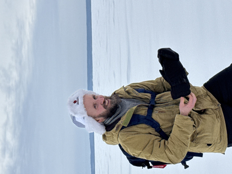 A male individual is depicted outdoors in Bolgar, Russia, against a snow-covered winter landscape under an overcast sky. The subject, positioned centrally, is a fair-skinned man with a short beard and a smiling expression, looking directly towards the camera. He wears a grey and white fur-lined ushanka-style hat with a small red emblem on the front, a light brown/tan winter jacket, a grey turtleneck or thick scarf, and black trousers. A black backpack with blue straps and a red "FLYTOP" tag is visible on his back. His left hand is partially open, holding a black winter mitten, while his right hand is obscured, appearing to be in the process of adjusting or donning the mitten. The background consists of a vast, flat expanse of white snow or ice, with a dark blue horizontal line in the far distance, likely indicating a frozen body of water or distant land, topped by a light grey, cloudy sky.