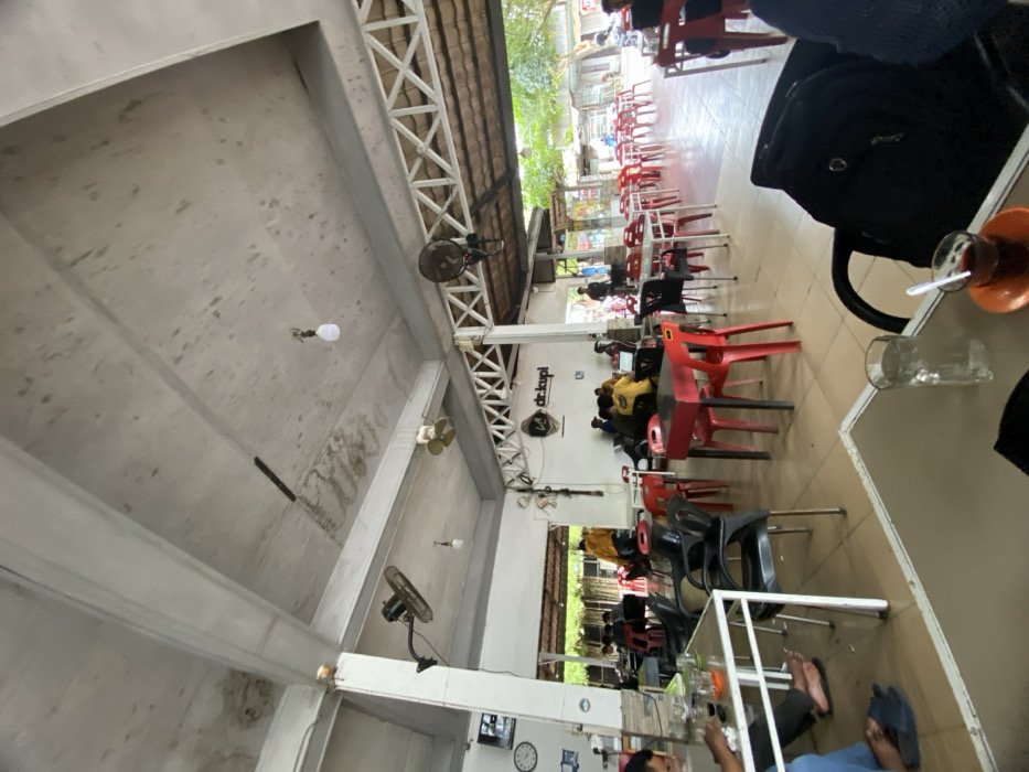 The image captures a partial interior view of the "dr.kupi" cafe in Lhokseumawe, Indonesia. The facility features a concrete ceiling with visible stains and exposed structural beams, from which bare lightbulbs and several wall-mounted oscillating fans are suspended. White-painted concrete pillars support the structure, and the floor is tiled. Approximately 15-20 individuals are present, primarily young adults. In the immediate left foreground, a person wearing a blue shirt and flip-flops is seated with crossed legs at a white table, on which a clear glass containing an orange liquid and another beverage are visible. In the mid-ground, a black square table with four red plastic chairs stands unoccupied. Behind this, multiple groups of people are seated at white rectangular tables, mostly in black plastic chairs. Several individuals are using laptops, including one person wearing a yellow shirt. A person in the right foreground has a black backpack resting on a chair next to a table, which holds a glass of water and a small glass of dark liquid on an orange saucer with a stir stick. The cafe transitions into an open-air section visible towards the background, featuring a thatched roof and a white wooden lattice structure. This area extends to an outdoor environment with trees and what appears to be a street or pathway, where additional people are standing or seated at tables with red plastic chairs arranged in rows. Individuals within the cafe are observed conversing, utilizing electronic devices, and consuming beverages. No notable interactions or actions beyond these casual activities are discernible.