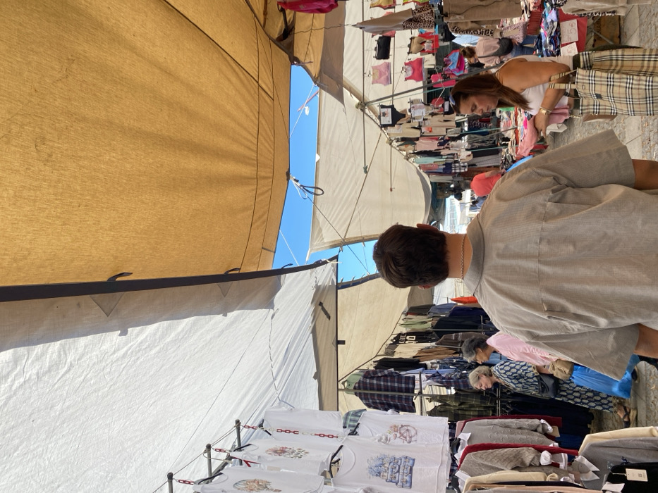 An image depicts an outdoor market scene in Vila Nova de Cerveira, Portugal, observed from a low-angle perspective looking forward down a market aisle