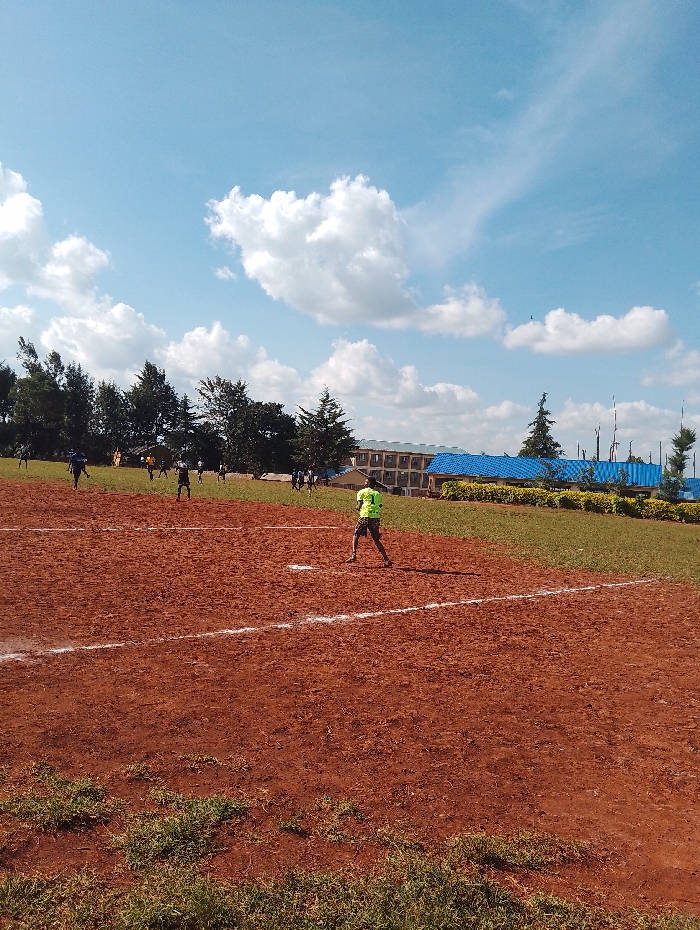 dirt field in Rungiri, Kenya (latitude: -1.249, longitude: 36.691), with a few people playing a game on it. A man in a lime green shirt is standing on the red dirt field, facing towards the camera. The man is the focus of the image, as he is the only person standing still. The other people in the background are all moving. There is a white line painted across the field, and the dirt is loose. There are trees and a building in the distance, and the sky is blue with white clouds.
