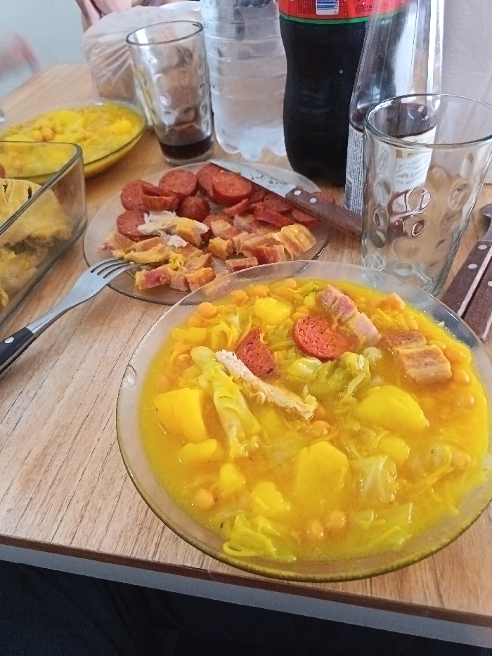 The image depicts a close-up, high-angle view of a wooden dining table laden with a variety of prepared food and beverages in an indoor, brightly lit residential setting. The precise location within Buenos Aires, Argentina, is not discernible from the visual evidence, but the prepared dishes are consistent with traditional Argentine home cuisine. In the foreground, a clear glass bowl contains a vibrant yellow stew, likely a locro, featuring distinct pieces of yellow potatoes, green cabbage, chickpeas, round slices of red chorizo, and strips of pork belly, all submerged in a thick yellowish broth. To the immediate left, a rectangular clear glass baking dish partially reveals a yellow casserole-like dish. Further left in the background, an oval clear glass dish contains another yellow-hued dish with visible chickpeas. In the mid-ground, a clear glass plate displays an assortment of sliced and cubed meats: round slices of red chorizo, cubed pieces of cured ham or bacon, and shredded white meat, possibly chicken. A metal knife with a brown handle rests on this plate. Beverages include a clear plastic bottle of mineral water and a dark plastic Coca-Cola bottle with a red and green label, partially visible behind the other items. Two clear, textured glass tumblers are present; one contains a dark liquid, and the other is empty. Utensils include a silver-colored fork with a black handle positioned near the rectangular dish and a silver spoon with a brown handle partially visible on the far right. A human hand and forearm are faintly visible in the upper left background, indicating the presence of at least one individual at the table.