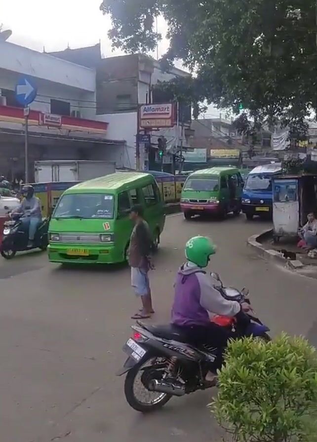 The camera captures a street scene in what appears to be a bustling Southeast Asian city. The main focus is on a group of small, boxy vans in various colors, predominantly green. One green van has its driver's side door open, with a man standing nearby. Other vans, painted pink and blue, are seen further down the road. A man wearing shorts and flip-flops stands in the middle of the road, seemingly directing traffic. To the left, a motorcyclist wearing a green helmet is waiting. Another motorcyclist passes behind the vans. Behind the vehicles are several buildings, including a store with an "Alfamart" sign. A blue directional sign is visible above the store. The sky is overcast, and the street is wet, suggesting recent rain. The scene is dynamic with people and vehicles in motion, depicting everyday urban activity.
