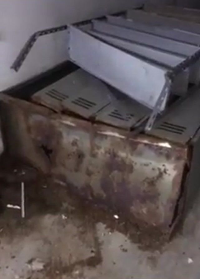 rusted metal container filled with metal shelving in a dilapidated room. The container has significant rust, indicating age and exposure to moisture. Inside, there are light-colored metal shelves with ventilation slots. The shelves are tilted and partially collapsed within the container. The room itself appears to be in poor condition, with visible stains on the floor and possibly on the wall in the background.