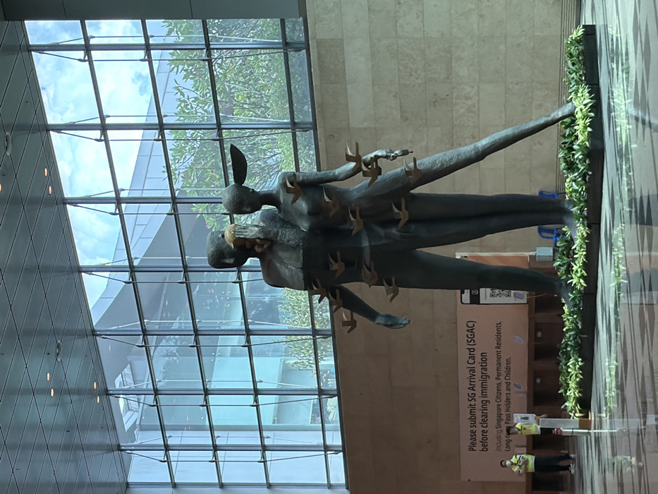 A statue of two figures, one with rabbit ears, stands in front of a large window. The statue is dark in color, with several small bird-like figures attached to its arms and torso. A sign with text reads "Please submit SG Arrival Card (SGAC) before clearing immigration, Including Singapore Citizens, Permanent Residents, Long-Term Pass Holders and Children." Two people in yellow vests are visible near the sign.
