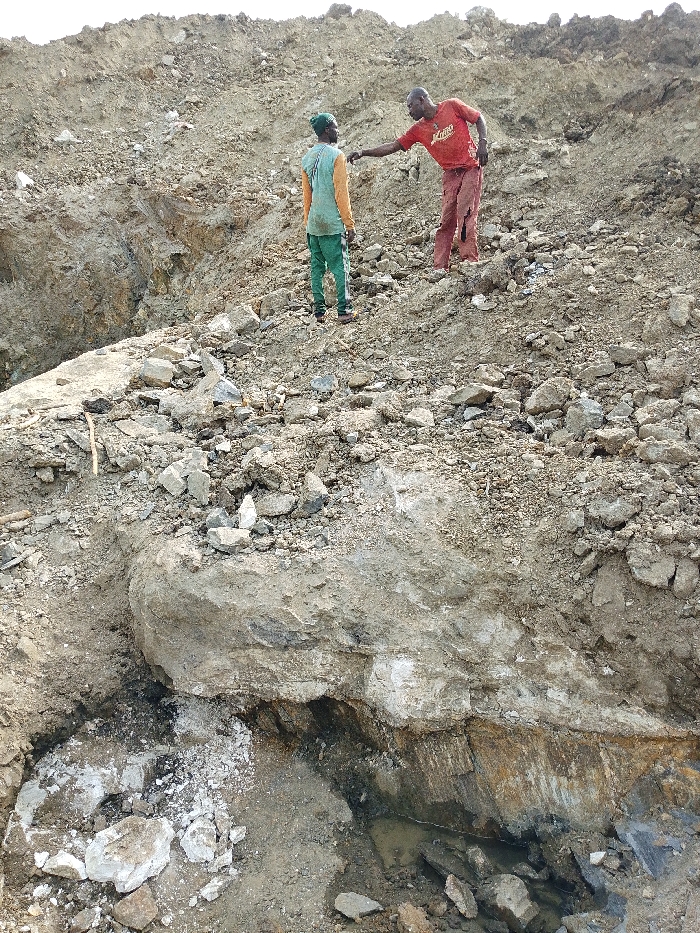 The scene depicts an excavated site in Otulu, Nigeria, characterized by disturbed earth, numerous loose rocks, and exposed rock formations
